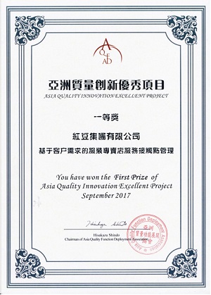 9月26日-27日,第二屆亞洲質(zhì)量功能展開與創(chuàng)新研討會在杭州舉行,紅豆集團發(fā)表的“基于客戶需求的連鎖專賣店服務(wù)接觸點管理”項目,榮獲亞洲質(zhì)量創(chuàng)新優(yōu)秀項目一等獎。國家質(zhì)檢總局質(zhì)量管理司副司長陳曉波,亞洲QFD協(xié)會會長、國際著名質(zhì)量專家、日本戴明獎評審委員長新藤久等國內(nèi)外知名專家學(xué)者擔(dān)任本次研討會嘉賓,現(xiàn)場共有200余家企業(yè)參加本次研討會。紅豆等30余家企業(yè)進入研討會現(xiàn)場發(fā)表環(huán)節(jié),經(jīng)專家評審和企業(yè)答辯,紅豆集團等10家企業(yè)發(fā)表的項目得到評審組高度認可,榮獲一等獎。