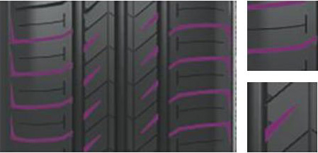 不等節距的對稱花紋塊布局,有效降低胎面與路面共振,減小噪音。